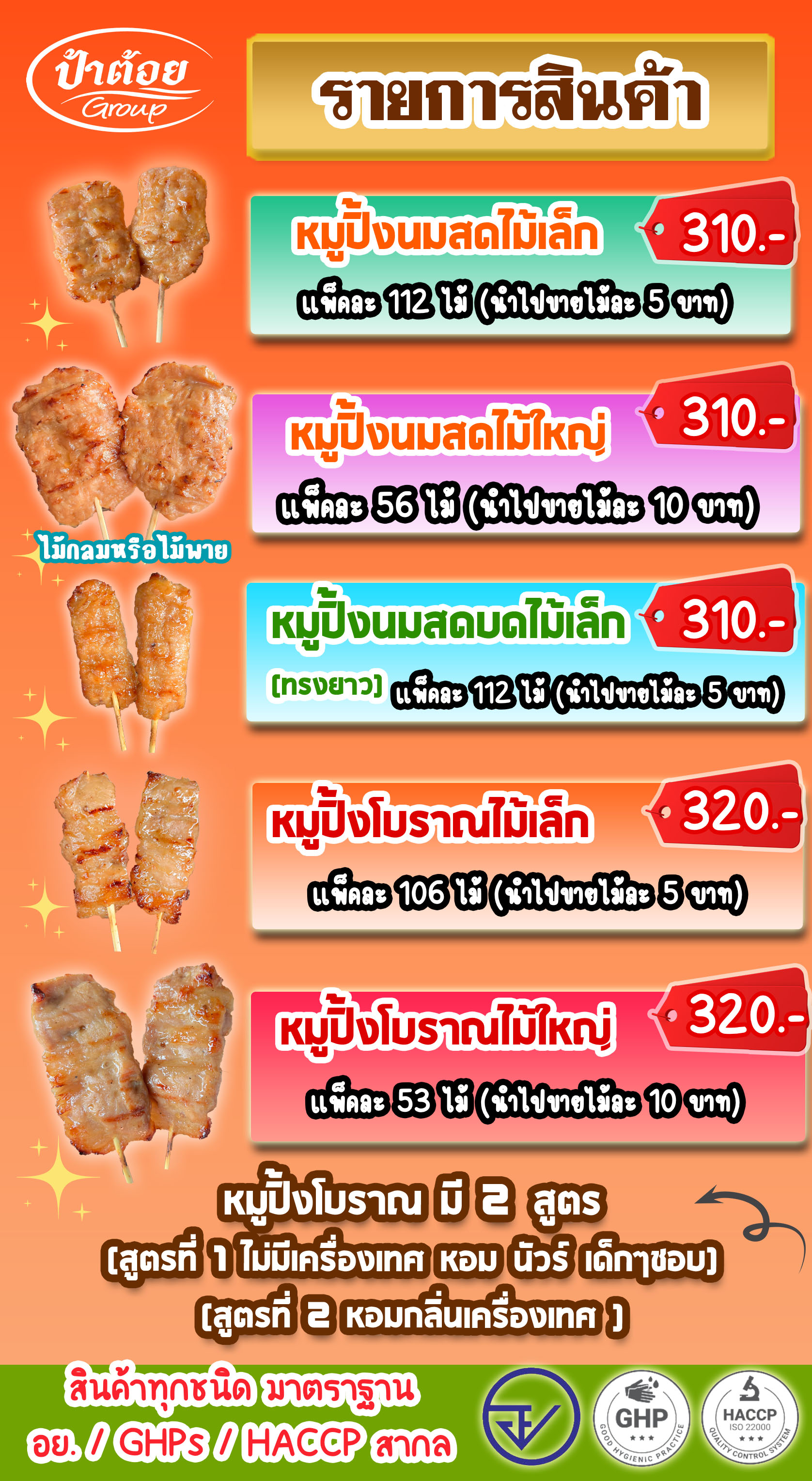 โรงงานหมูปิ้งนมสดป้าต้อย เราคือผู้ผลิตและจัดจำหน่ายหมูปิ้งนมสด หมูปิ้งโบราณ หมูปิ้งสูตรดั้งเดิม ไก่ย่างแดงโบราณ ไก่ย่างเหลืองพริกไทยดำ /ผลิตภัณฑ์อื่นๆ